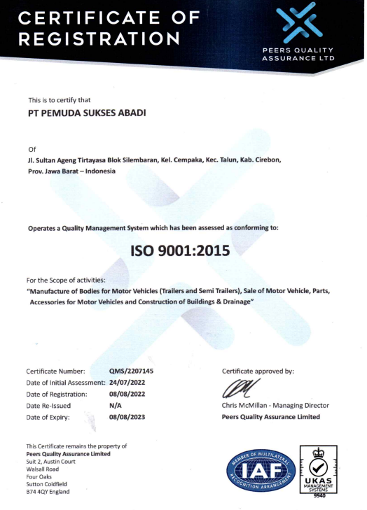 PT. Pemuda Sukses Abadi didirikan pada 24 September 2019, dengan kualitas dan material terbaik serta didukung dengan teknologi terkini dan dikerjakan oleh tim ahli yang berpengalaman di bidangnya, sehingga menghasilkan produk yang berkualitas. Dapatkan segala fasilitas dan layanan dari perusahaan kami, yang akan kami sediakan untuk melayani segala kebutuhan armada operasional, guna meningkatkan kinerja dan profitabilitas perusahaan.